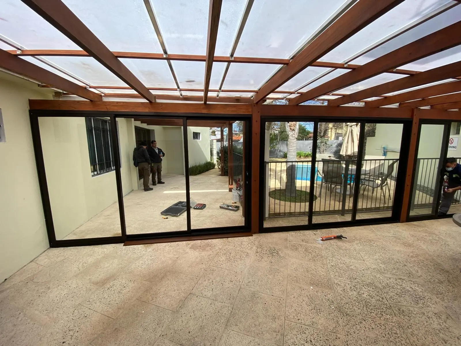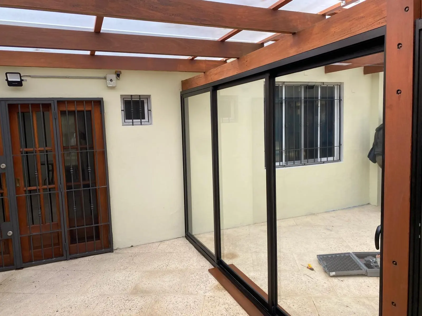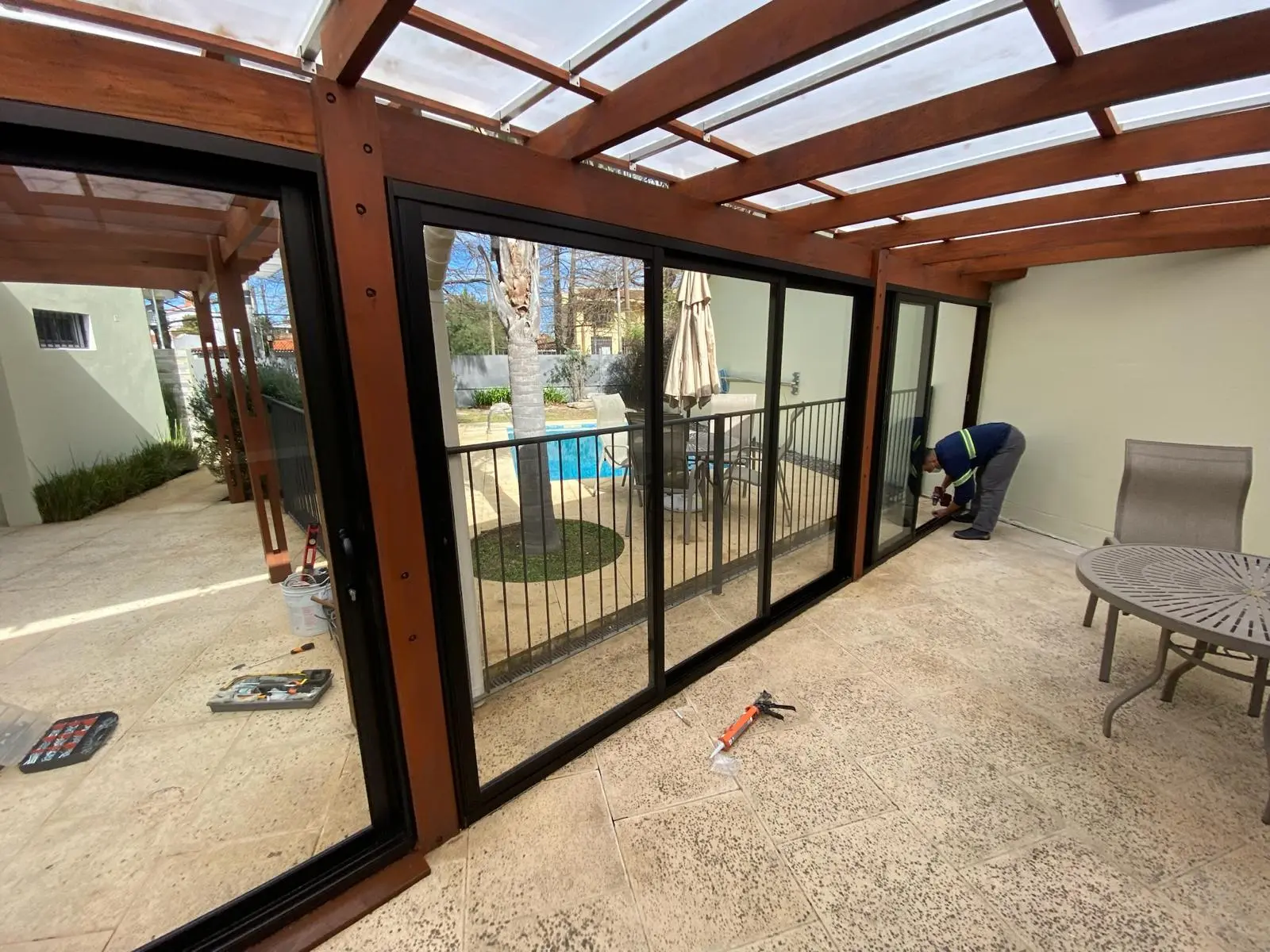 Se instaló un sistema de 3 hojas sobre 3 carriles en la Serie Gala, permitiendo una apertura del 66% del vano. El acabado en Anolok aporta una estética premium y duradera, mientras que el uso de vidrio laminado 4+4 garantiza máxima seguridad ante impactos y protección contra rayos UV.