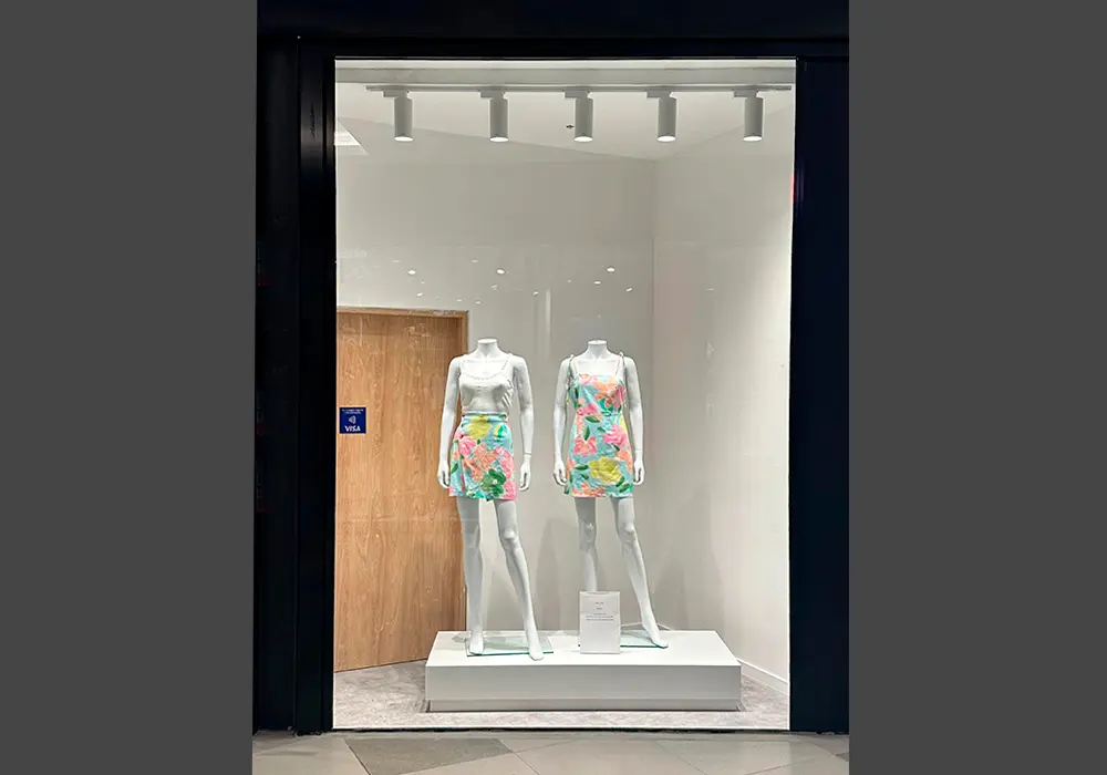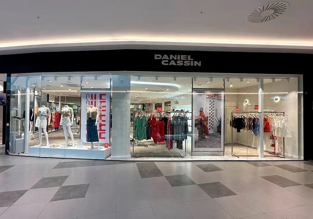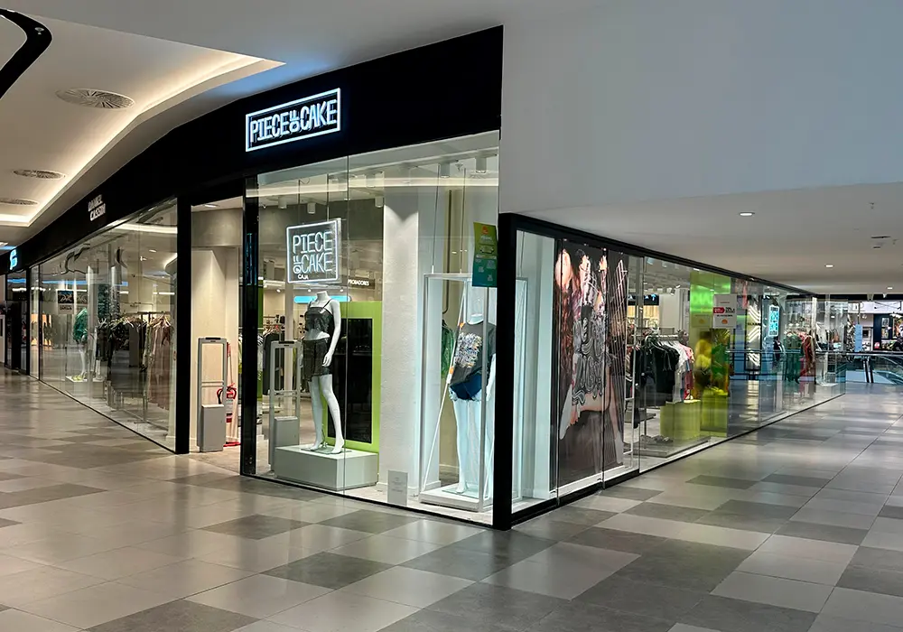 Remodelación de la fachada de la tienda Piece of Cake en el Punta Shopping. El proyecto destaca por la instalación de un cristal en supermedida de 4,00 x 2,60 metros, una pieza de gran escala que permite una integración visual total entre el interior del local y el centro comercial. Se utilizó vidrio laminado 5+5 para cumplir con los más altos estándares de seguridad y resistencia requeridos en áreas de alto tránsito.